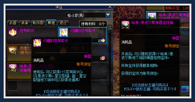 除此之外,休亚出10个苍穹碎片,可兑换一个账绑闪耀的苍穹碎片,1200个苍穹碎片,能换一个神器宝箱,开出哈林或者泰波尔斯神器。其实,这是策划专门为苍穹碎片过剩的玩家准备的,来进行打造小号角色。