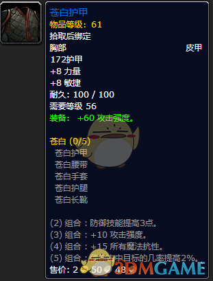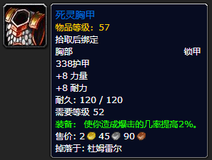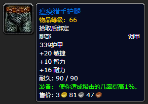 另外T0衣服也是可以考虑的胸甲,由黑上的达基萨斯将军将军掉落,但也仅仅是“可以考虑”,单独拿出来看的话,21敏捷没有攻强,没有暴击没有命中,这样的属性显然是不如苍白护甲的。