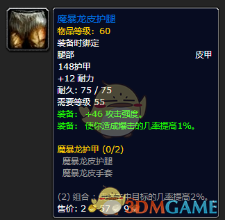 如果你选择用了魔暴龙手的话,可以选择把裤子也买了凑个套装把2%命中的效果出出来。本身46攻强和1%暴击的效果也并不弱。
