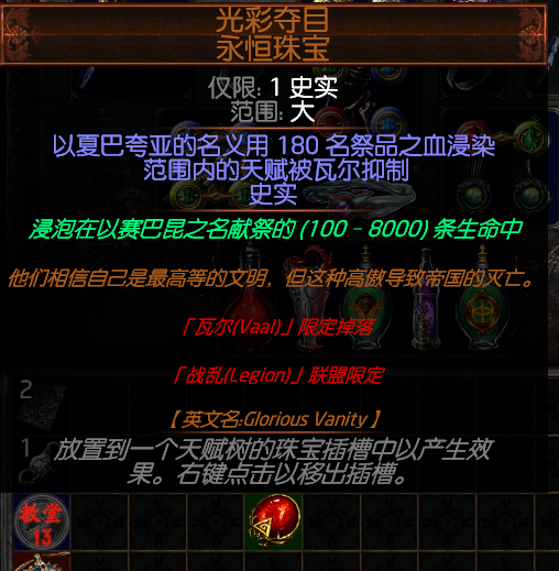 图中红色区域是用了“夏巴夸亚 瓦尔永恒珠宝”的效果。我上面说到混沌抗性有至关重要的作用就在此处。
