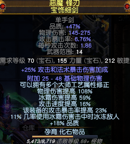 这个剑要2把,我自家做的,先买一个底子,在用完美化石点出高的品质,在用改造洗出T1的