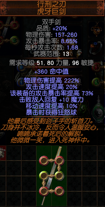 武器用虎牙剑,常驻狂怒球,攻击速度与暴击率都非常不错,能和塑星大剑扳腕子的一把极强力暗金武器