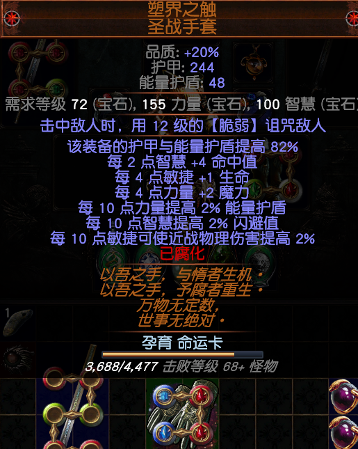 手套用T17岳父出的塑界之触,属性全吃,效果很棒,产量大,随便瓦,直接用毕业手套-击中脆弱(这条增伤能有额外25%,必选)