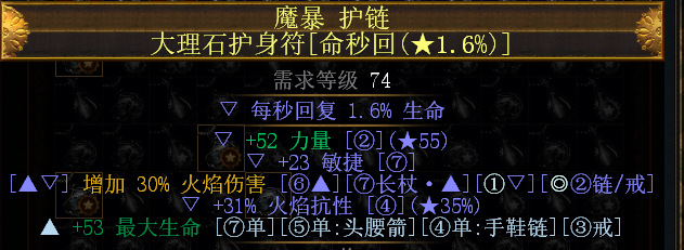 项链:打T18就带狼王,其他带普通的黄装即可,词缀找,最大生命+火焰伤害+抗性/敏捷,附魔1%秒回或范围你不是天天打T18,不用买狼王的,毕竟冰转狼王可遇不可求,尤其新区,有点小走位,主要躲一下岳父的3连发冰球就行了。