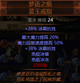 ----戒指:一颗蓝玉之痕,免冰冻免冰缓很好用,尤其是点了灵体之体之后很容易被冰,另外一个高力量/ES/抗性就行。有条件的可以瓦出力量百分比。