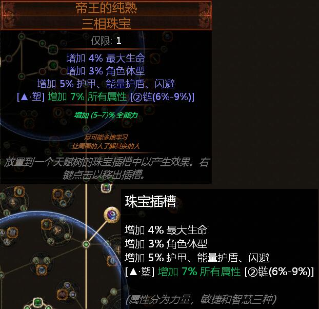 帝王的纯熟,提供7%所有属性,4%生命,5%护甲、能量护盾、闪避。太贵不推荐,可用黄珠宝代替。