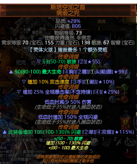 我们的基础血量非常少,整套装备,只有胸甲头部和手套上有基础血量,这是完全不够的,即使用两颗温柔之力,也只能把血量从6200提升到6700,整体提升并不大,所以已经不能再放弃头上的血了,即使用黄头,也一定要找高血的,攻速暴击已经不重要了,用的护甲头的话,还能把钢铁之肤换成熔岩护盾,这样打T16BOSS更有底气,但是要把石英药换成护甲药,双闪改到其他地方,加到左边多拿一个暴击球也不错。