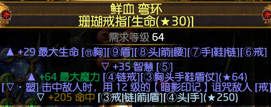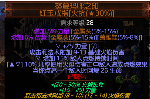 1.两颗戒指,一颗努葛玛呼之印,我们喝药之后,点燃率91%,可以说是相当于击中回血,瓦的话随便瓦,怎么瓦都比火焰抗性有用。另一颗戒指,12级暗影印记是必须的,其他的附魔个命中,我这颗戒指上只有这两个有用,其他的完全是废词缀,有资源的可以搞个多大师,上个生命暴击或者其他的啥都行。。。