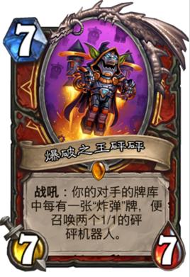 炸弹分两种情况,炸了和没炸。炸了对面就掉血呗,如果没有爆炸的话,可以为我们的"爆破之王砰砰"召唤11的小炸弹,狂野的那张777的砰砰博士可曾经被誉为炉石第一橙,现在咱们可以在不亏身材和费用的情况下,召唤更多的小炸弹,那强度是不需要多解释的。