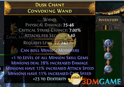 这是新出的法杖底子,可以洗出召唤相关的词缀。要求很简单,改造洗个“+1所有召唤物宝石等级”就行,然后增幅,富豪,可以附魔召唤物伤害或者攻击速度。我这把算是中规中矩吧。