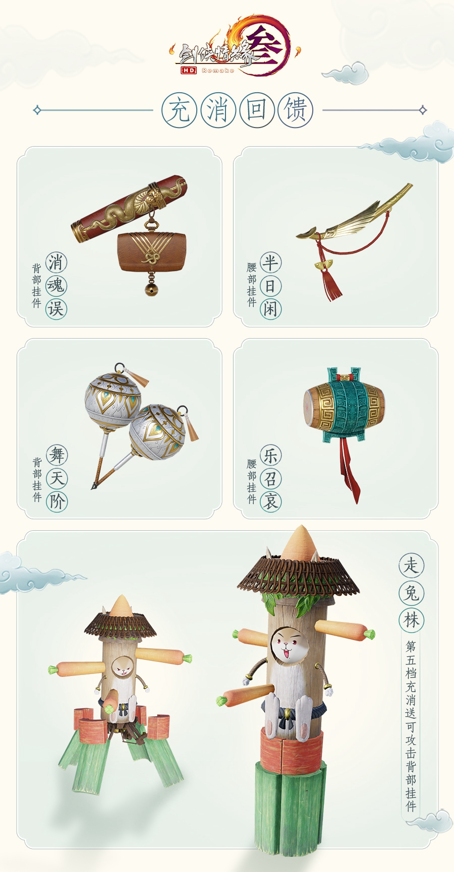 崭新的九月,褪去夏日炎炎的热烈,一切都是全新的开始!侠士们于9月参与充消活动,还可根据充消金额获得古色古香的背部挂件“消魂误”、腰部挂件“半日闲”,背部挂件“舞天阶”、腰部挂件“乐召哀”奖励。此外,第五档奉送背部特效挂件“ 走兔株”,也就是传说中的木武童2.0,呆萌可爱颜值爆表!