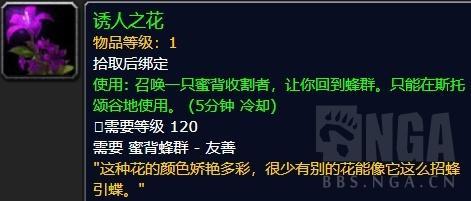 使用: 召唤一只蜜背收割者,让你回到蜂群。只能在斯托颂谷地使用。 (5分钟 冷却)