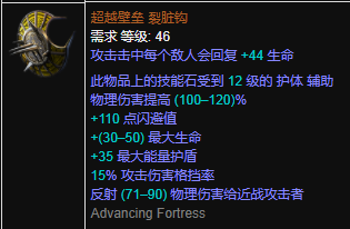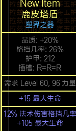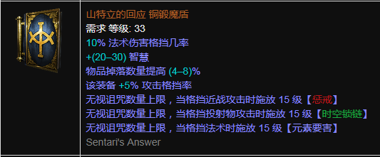 盾牌:优先26基础格挡的盾牌(塑界底),然后改造、洗出12%法术格挡,再增幅、富豪。大师血量即可,前期也可以使用“波纹盾”“铜锻魔盾”、“古代圆盾”来过度效果还不错,价格点金到几个C不等,波纹盾优势12%法术格挡和攻击格挡直接满足需求,不过抗性有压力,铜锻魔盾的优势白嫖诅咒,不过没血没抗,古代圆盾优势有抗性,高格挡,被攻击后直接+20%法术格挡,法术格挡反作用后又可以+20%攻击格挡,不过没血。当然盾牌其实前期很多好用的,自己如果底子不足26格挡的话,那么你需要工艺附魔“攻击格挡”补齐或者珠宝找缺少的格挡。后期可以打造出:格挡回血、格挡感电、格挡冰缓等格挡流顶级盾。
