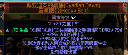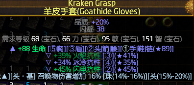 腰带:高血高抗即可,过度期间可以点金或者1-2C价格入手这个腰带补抗性和血量具备价格优势,副作用召唤不怕,价格高了,自己拣高血的腰带,附魔大师抗性也很不错,后期血和抗性足够的情况下更换双洞深渊传奇腰带,放入极品3-4属性极品珠宝,提高输出。