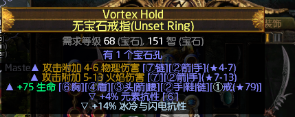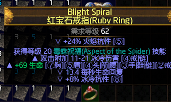 戒指:高血、高抗即可、这个赛季新增可以工艺台附魔召唤生物速度了(项链、戒指),如不追求极限速度的话,高血高抗自己附魔召唤生物速度即可,也可以用矿洞产出35%召唤伤害的戒指制作出高血+高抗,然后附魔召唤生物速度词缀。必备1个“潜能戒指”。便于释放“号召”,因为光环的搭配需要一个“蛛之势”我是直接淘到一个自带的,如果没有这个蛛之势,则多带一个潜能戒指开“极地冰甲”过度,属性相似,魔力占用都是25%。