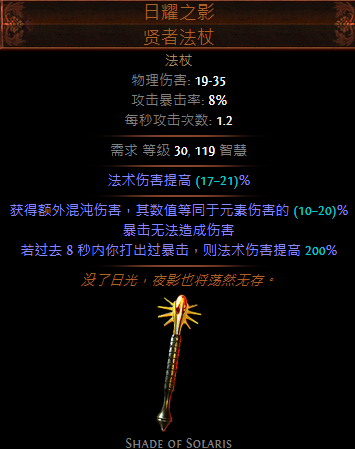 这边通常为开始打地图,升华过三阶段以后的情形,在这会有转捩点,可考虑继续玩元素超载,拿两把日耀之影,只点一开始的两种升华点(第三第四都会影响到日曜的输出),直至后来换潜能魔棒,或者直接拿多里亚尼的幻化之杖开始走暴殇路线
