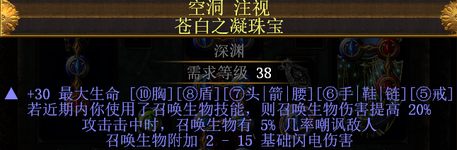 有生命,有召唤生物嘲讽,近期放召唤技能会增加召唤生物伤害的珠宝就可以带。嘲讽最好堆到20%打T18就很舒服的僵尸嘲讽长老。
