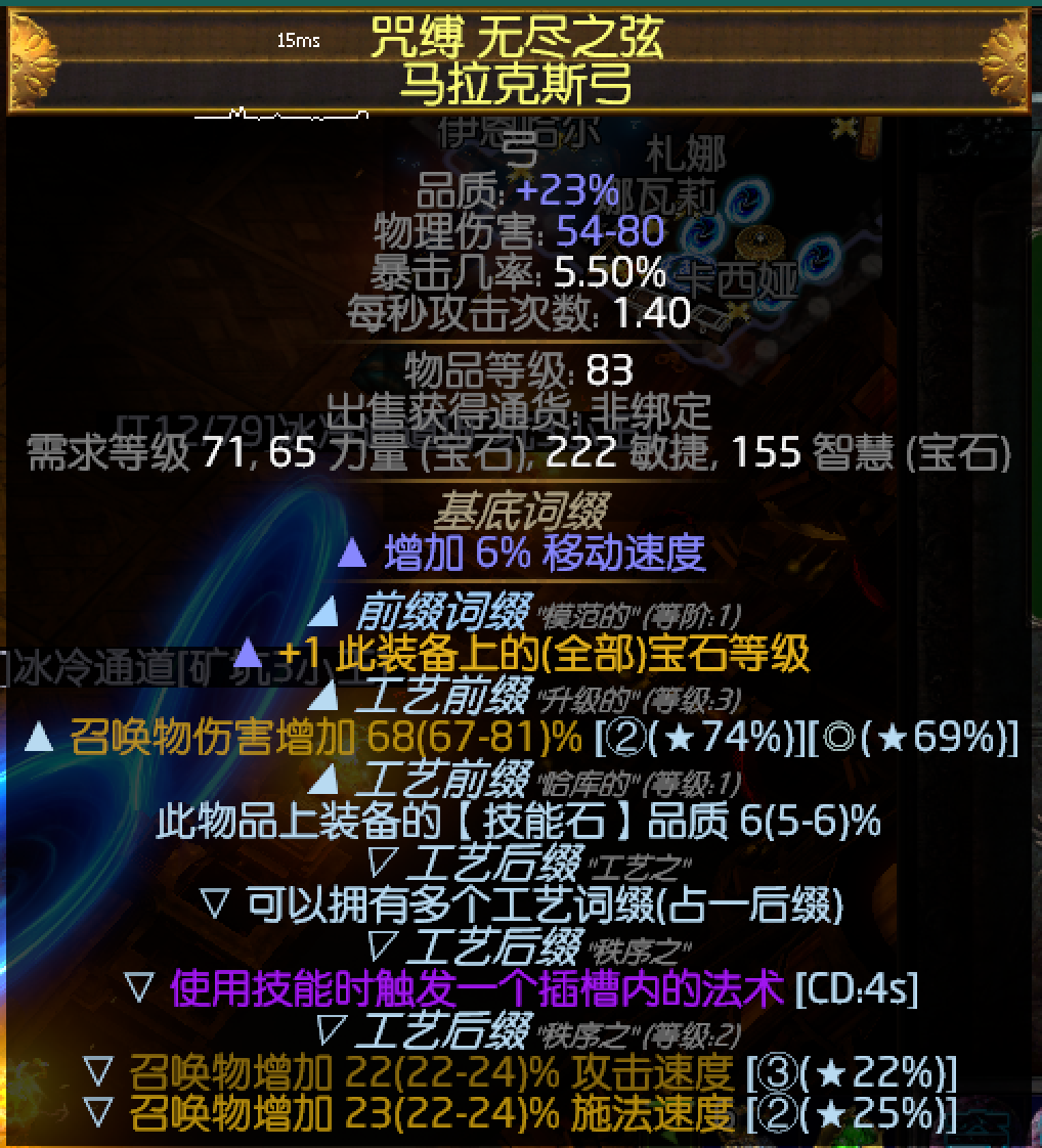 最终成功获得一把拥有【主动技能石等级+1 和 辅助技能石等级 +2】的六连弓,其它词缀自己随意挑选最适合自己的,使用本bd的建议选择召唤生物相关词缀