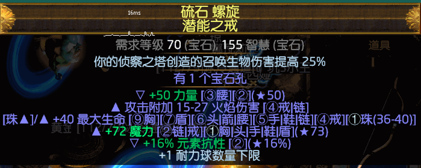 翻翻市集又花了60c淘了个50力40血16全抗的潜能之戒,免除了以前的闪电伤害,现在元素之相可以同时让冰霜和闪电抗性-50%,唯一的缺憾就是戴上电抗竟然还差2点,只差两点抗性啊亲们!!纠结了半天,又不想为了两点电抗专门搞个工艺后缀加个20左右的闪电抗性,但后来突然想起来,一个耐力球不仅仅加4%的物理伤害硬减伤,还同时加4%的元素全抗,因此最后附魔了+1耐力球下限,简直完美~