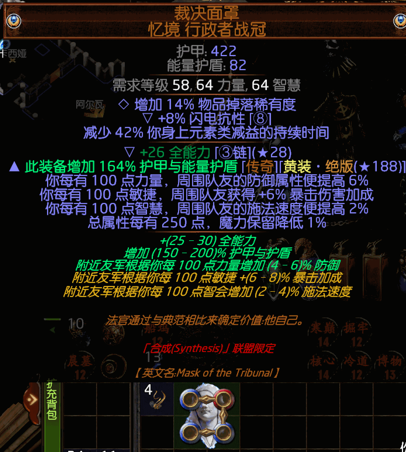 因为千力头盔可以将人物一半的力量属性,也就是至少500点力量,添加给召唤生物,加上手套+100点的力量,因此可以将幻化守卫头盔的增益属性发挥差不多百分之二十的防御加强,只可惜这个单纯是inc增量,而不是额外增量,实际人物增加的护盾是几百点。