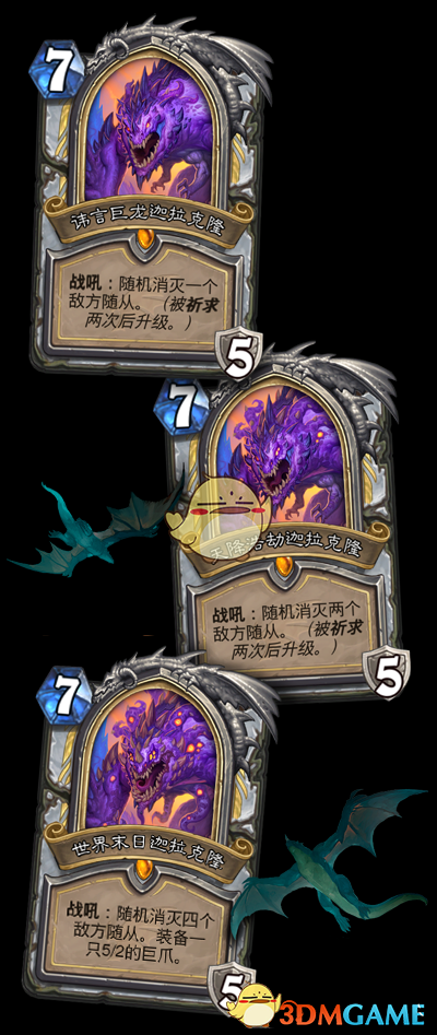 在对战中,你可以使用带有新关键字“祈求”的卡牌,不断升级迦拉克隆。向迦拉克隆祈求两次,可以将他从基础形态升级为“天降浩劫迦拉克隆”。再祈求两次后,迦拉克隆就会升级为威力无穷的最终形态“世界末日迦拉克隆”。升级为新形态会使迦拉克隆的战吼效果翻倍,使用最终形态的迦拉克隆还可装备一把5/2的武器,足以轻松撕碎对手。当你使用迦拉克隆并触发战吼后,祈求卡牌虽然依旧能触发效果,但无法继续升级迦拉克隆。