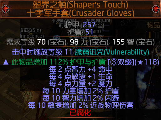 (血盾流绑定胸甲,既然都选择千力了,堆力量给护盾岂不美哉?有生命有护盾有抗性我爱了,注意:衣服上有个狂热誓言就是生命回复套用至能量护盾效果,非常的牛批,看后面我站撸T18吃完所有技能的视频你们就懂了)
