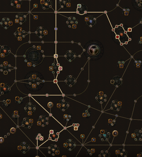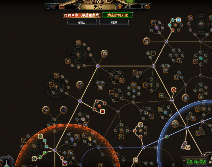 这是本人97级的天赋图,如果等级不到可适当删减血点根据自己实际情况而定这里就不详解了(注意第三张图有两个中点是我用BUG涂油的,左边中点完全不必点我点是因为有军团珠宝插在那里有好属性并且提供物减,右边中点需要额外花四点天赋,没涂油的朋友不必担心,减少四点血点点过去就行了,血量只会少400左右,但是召唤伤多了40,平时刷图盾都不掉,更别说掉血了,所以完全不用担心少点了血有什么影响)