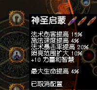 手套四连:火焰净化-元素净化-纪律-三级启蒙(纪律是需要开的,火焰净化跟元素净化是因为我黄装抗不够才开,每个人装备不一样根据自己实际情况选择开什么光环,抗性一定要优先堆满,如果满了之后才会考虑增伤光环什么憎恨迅捷之类的,先保证自己生存,其次再追求伤害)