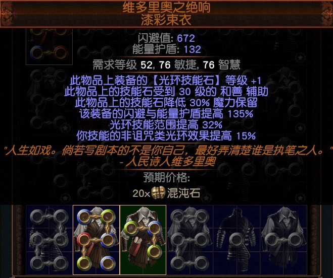 20c暗金衣服——维多里奥之绝响 漆彩束衣(光环衣)(选择非诅咒类光环效果提高≥13%的,前中期只要5孔就够用)
