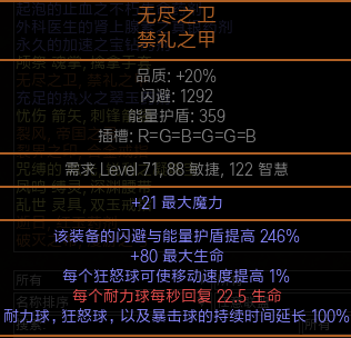 1E买的。这衣服是我们低预算的无奈之选,但是也算契合我们的BD,每个绿球加移速,每个球的持续时间延长可保证不容易断球,不错的生命,耐力球给回血也可缓解长老弓带来的副作用,都是我们所需要的。有钱当然选猫衣或西里衣服了。