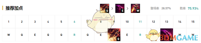 Q的隐身以及位移能够让他很好的接近敌方英雄,而且下一次的普攻伤害也很高。E拥有100%的AD加成,还带有减速效果,让小丑gank效率更高。不过值得一提的是,在一级时小丑需要点出W的惊吓魔盒,这样恐惧野怪之后清野更快。