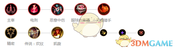 主宰能够提升小丑的爆发,精密可以强化他的攻击。电刑让他的一套技能伤害更高,恶意中伤搭配上盒子的恐惧效果,能够打出不错的真实伤害,无情猎手提供的移速加成,让小丑的跑图能力更强。精密中的传说:欢欣可以提升小丑的攻速,凯旋提升他在团战中的收割和生存能力。