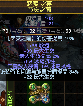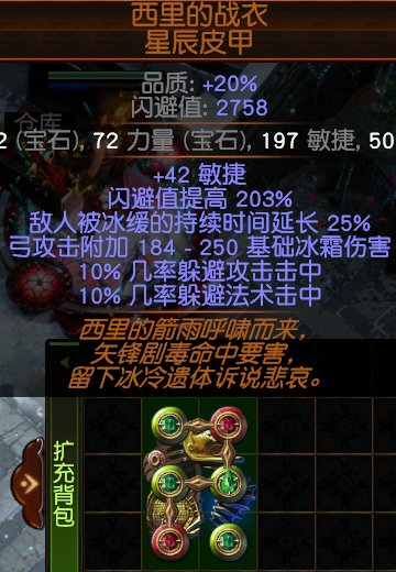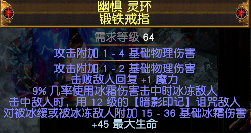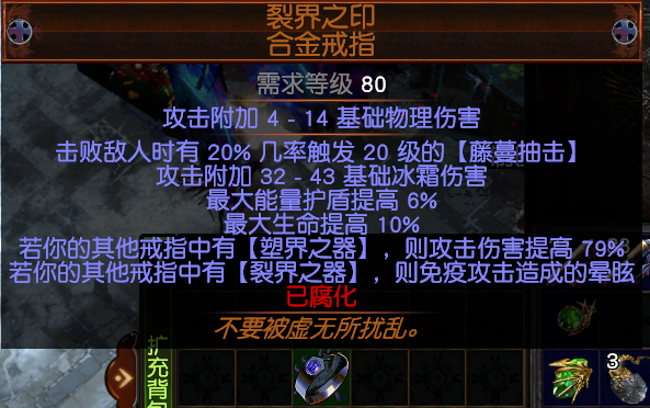 戒指2:选择塑界底的。需要两条必要词缀:【暗影印记】和击中冰缓敌人附加冰点伤(尽量选择T1的),其他选择生命,补抗,都行,看自己实际情况调整