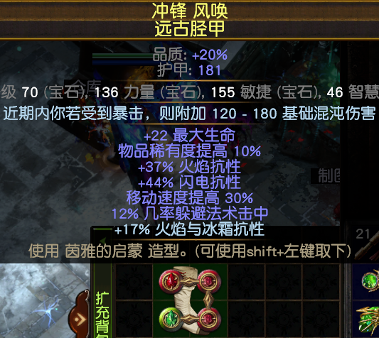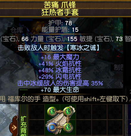 手套:补抗,高生命。这里有个细节,选择带普华特词缀的手套--击中冰缓敌人伤害提高