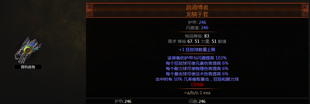 要是不缺抗可以选择得球手套--浪涌缚者,红球可以增加生存,狂怒球增加元素伤完美契合,要选择瓦出绿球+1的