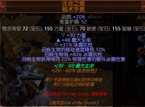 手套非核心,但能提高很多伤害,这套BD里大概有百分之7的提升。黄的手套也可以,降低很多抗性压力。绝对不能带新的赛季召唤转伤手套。反正蜘蛛不怕反伤