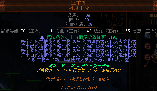 4. 手套 召唤新手套全绿孔收益最大,但由于技能限制,我最终选择2绿1蓝1红