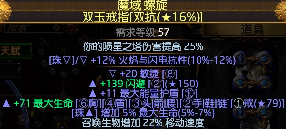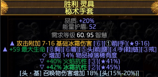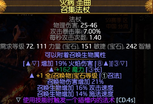 1、武器:72级的召集法杖(洗出+1召唤生物等级,召唤伤害、召唤施法速度、召唤移速都是可以选择的)