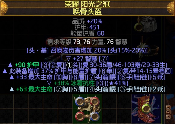 3、头盔:金装 唤骨头盔,后期使用+3召唤等级带召唤生物伤害的头盔,有集中范围更好