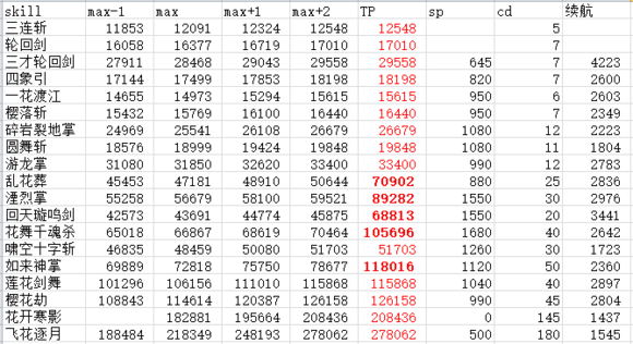 即将到来的普雷为20秒输出时间,在这个版本里,爆剑(回天璇鸣剑的别称)的伤害有大幅度加强,而乱花葬没有变化,现版本两者伤害已经相近了。其中,爆剑CD为20秒,光剑16.2秒,可以在20秒内丢出2个爆剑,而乱花葬CD为25秒,光剑也是超过了20秒,在20秒内只能丢出一个。因此,TP优先将爆剑点满,其它的加给乱花葬。