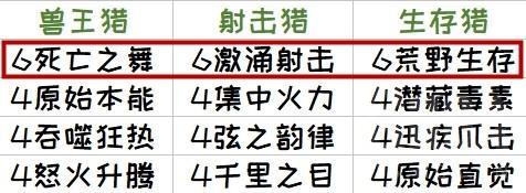 我们看猎人的6件特质装,可以看到都有死舞,激涌和荒野生存。而且你肯定发现了,这3个特质连在一起,同时出现在3环或者4环。除了这3个连在一起的核心特质。特质装还会有6个配套特质的位置,这些特质也就是表格里标4的特质。