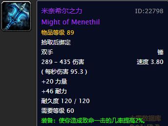 但,这二者肯定不是怀旧服中最强的双手武器,若问为何,那就是其杀伤力显然还不够巨大的。如果要问谁才是怀旧服中最强的双手武器,这答案当然只有一个,这便是克尔苏加德掉落的双手锤:米奈希尔之力。