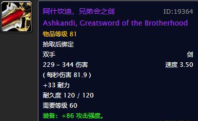 再来看看奈法利安掉落的兄弟会之剑,攻速略快,实际伤害略低,最大的优势就是比邪恶力量巨剑多13点耐力,但攻强却少12点。毫无疑问,对于战士而言,肯定是拿邪恶力量巨剑所造成的的伤害更高,这肯定没有悬念,只不过兄弟会之剑的优势在于多了13点耐力罢了。