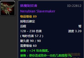 仔细看看其属性,竟然有着3.2的超慢攻速,每秒伤害高达57.2,直接伤害为128-238。要知道瞄准射击的读条时间为3秒,3.2的攻速意味着与之不太冲突。不仅如此,蛛魔制奴者还加24点攻强,1%暴击。毫无疑问,这样的属性对于猎人而言肯定是极品中的极品。