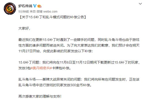 炉石传说在更新15.6补丁的时候遇到很多问题,因此炉石传说官方发布了《关于15. 6 补丁和乱斗模式问题的补偿公告》,送3包奥丹姆奇兵卡牌包作为补偿。