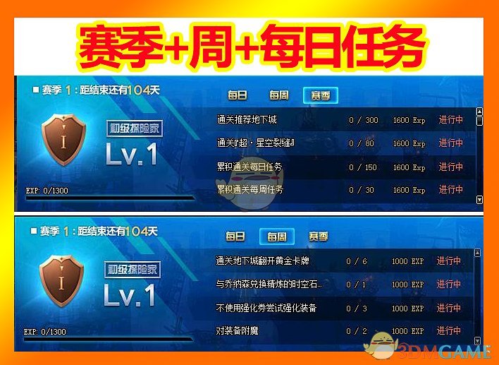 每日任务共103天,任务目前没有更新。每周任务活动共十五周,单个任务1000经验,每周4000共计获得60000点探险经验值。赛季任务18个,单个任务经验1600,共28800点经验值。新版史诗之路上线后和这个活动是一起的,刷图的活动那个也算次数的。所以玩家并不需要肝副本,刷刷活动就能完成任务领取奖励和经验。