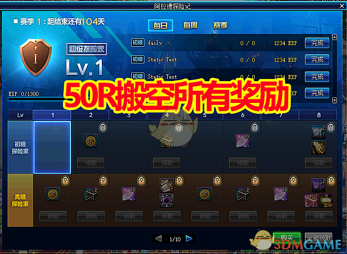根据上面所得,只需要在103天内获得15200经验值。也就是说只要每日任务经验超过147.57点的话,就可以只氪金50R的高级资格证,就可以获得全部奖励。这里说明一下:并不是说是要肝100天,而是在103天内分摊15200经验就可以拿满。