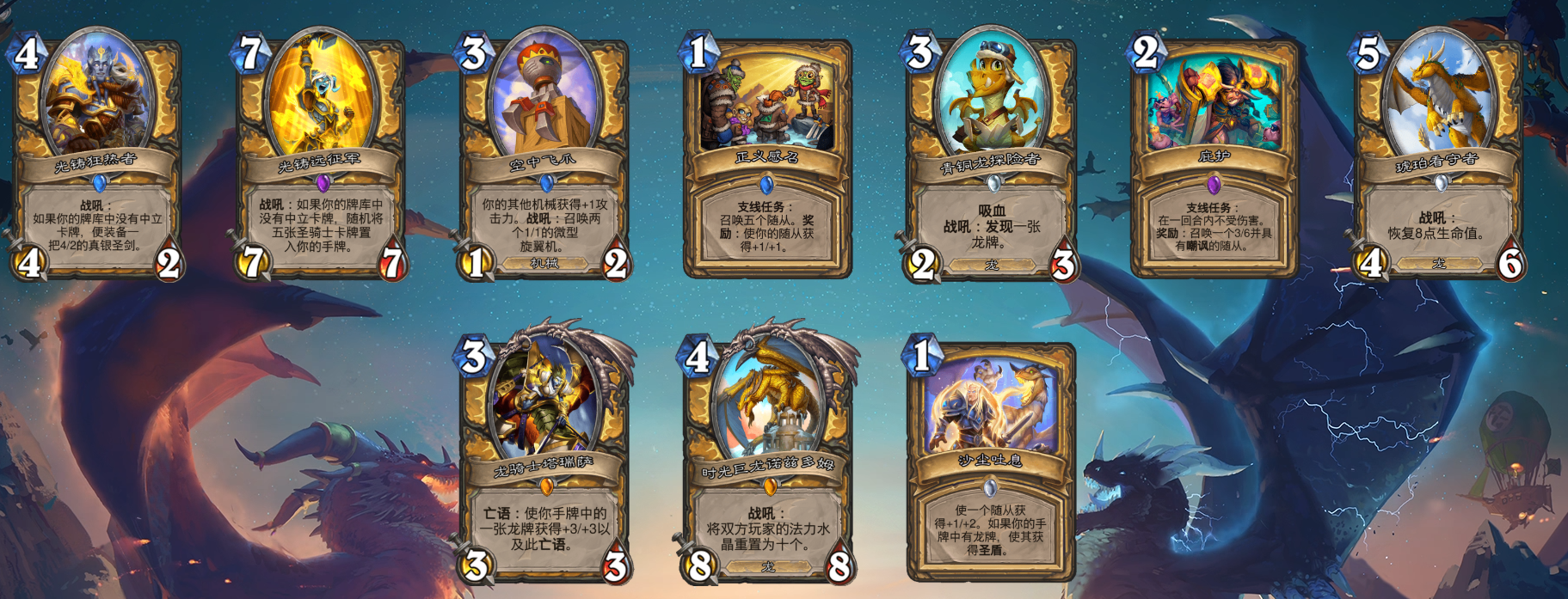 龙牌,正义职业都有一张发现龙的牌,并且不同职业有不同的额外效果(德-嘲讽,猎-剧毒,法-法伤,骑-?)。