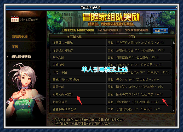 在体验服,冒险家组队奖励中,已经很明确的透露,单人魔界大战将来临。引导模式,就是所谓的单人,照搬韩服的话,跟单人普雷难度相当。打过单人普雷的都知道,难度十分的低,装备稍微强一些,一路怪物都秒过,丝毫不讲究机制。因此,国服上线魔界大战单人引导模式,对玩家来说,机制可忽视。
