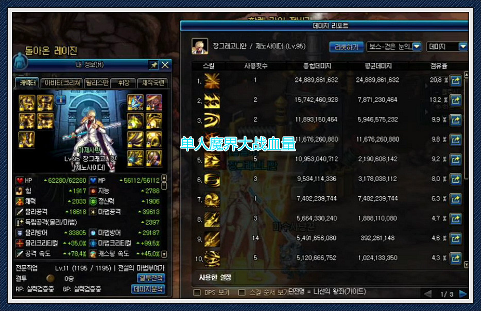 魔界大战单人引导模式,照搬韩服,不血量加倍的话,差不多2分钟就能打过去。韩服玩家经过实测,单人情况下的地图,难度实在太低。如图所示的光枪,普雷装备毕业,站街2788的智力。韩服没有诸多特色细节,跟国服的面板,差距显得较大。
